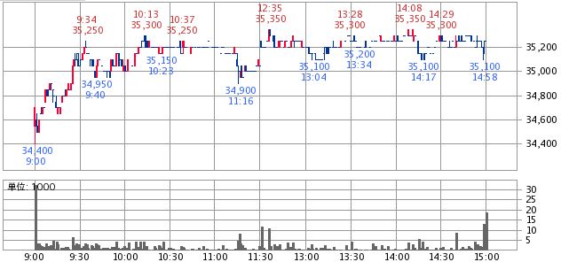 ファーストリテイリングは11;10頃まで安定して値を保っていましたが、先物への売り仕掛けが影響して11:16に34,900円まで下落し、後場はギャップアップしてで始まり、12:35に本日の最高値を付けた後は14時過ぎまで安定して値を保っていましたが、14:08から14:17の間に250円、14:50過ぎから14:58へ僅か2・3分の間で150円と日経平均先物の牛仕掛けに影響されて値を崩したのは日経平均の動きと同じとなっています。