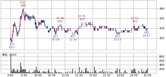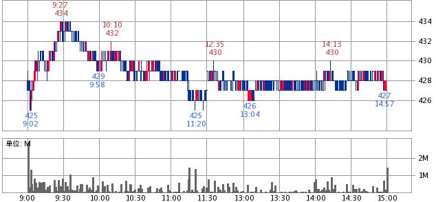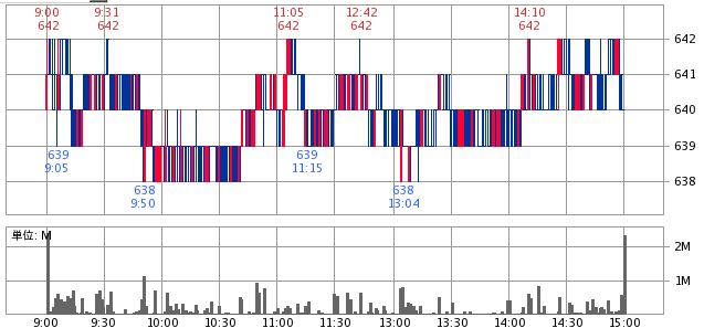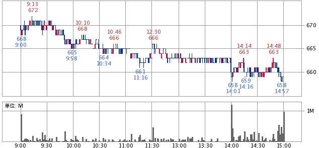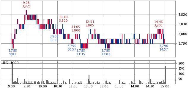 三菱UFJは9:30頃に本日の最高値をつけた点や11:15に直前より急落、大引け直前でも急落した点は日経平均と似ていますが、日中の値幅はわずか4円となっており、日経平均よりさらに安定した相場展開となりました。