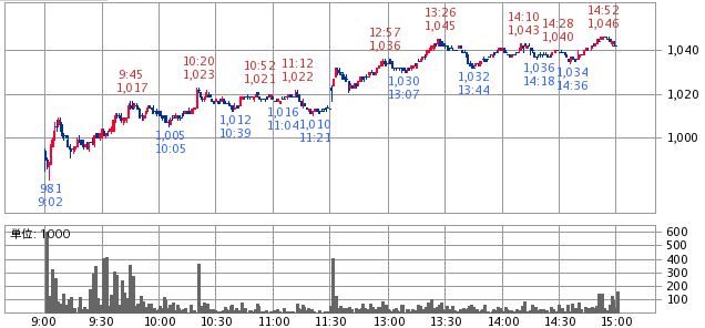 三井住友は10:49に4,725円と本日の最高値をつけたころに出来高が急増して本日最大となっています。