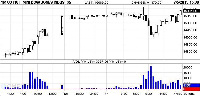 しかし、シカゴグローベックスのダウ平均先物価格はNY時間7月4日20:00(シカゴ時間7月4日18:00、日本時間7月5日8:00)の15,050ドルを付けていますから、NYダウはその価格を挟んで約50ドル下の水準で始まって約50ドル上昇した形なっており、その後NY時間9:49(シカゴ時間7:49、日本時間21:49)~NY時間10:24(シカゴ時間8:24、日本時間22:24)頃に15,087.73ドルから14,971.59ドルへ急落して朝方の上昇分の値を消し、その後NY時間10:00(シカゴ時間10:00、日本時間24:00)に約15,010ドルから約15,080ドル、NY時間14:00(シカゴ時間12:00、日本時間7月6日2:00)頃からNY時間14:38(シカゴ時間12:38、日本時間7月6日2:38)に約15,070ドルから約15,130.89ドルまで再び値を戻し、終値が15,135.84ドルとなっていますから、NYダウだけを見ると確かに米国の製造業雇用者数、非農業部門雇用者数、平均時給などの発表を受けて上昇したと見られますが、NY時間7月4日20:00(シカゴ時間7月4日18:00、日本時間7月5日8:00)のダウ平均先物価格から見た場合はそこから僅か50ドルほどの上昇に留まっていますので、米国の製造業雇用者数、非農業部門雇用者数、平均時給などの発表を受けて上昇した…という部分は実は上昇分の半分以下と見たほうが良さそうです。