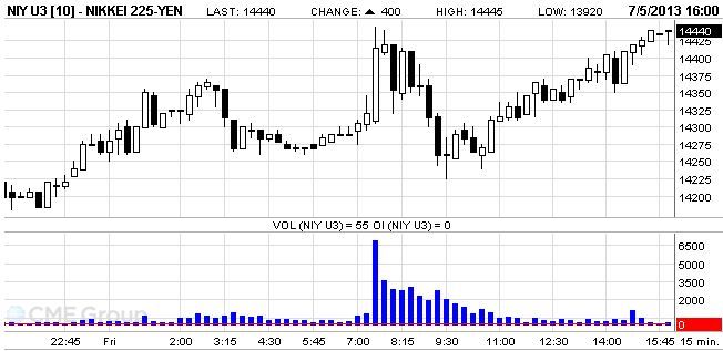 なお、NY時間9:30(シカゴ時間7:30、日本時間21:30)の6月の米国の製造業雇用者数、非農業部門雇用者数、平均時給などの発表を受けてNYダウがNY時間9:30(シカゴ時間7:30、日本時間21:30)の14,992.92ドルから2分後のNY時間9:32(シカゴ時間7:32、日本時間21:32)に15,104.51ドルへ一気に100ドル以上上昇したのを受けて日経平均先物もNY時間9:30(シカゴ時間7:30、日本時間21:30)~NY時間9:45(シカゴ時間7:45、日本時間21:45)頃に14,300円から14,440円まで一気に上昇すると共に100.00円から101.00円と円安ドル高なっていますから、昨晩のシカゴグローベックスの日経平均先物価格の上昇はNYダウが米国の製造業雇用者数、非農業部門雇用者数、平均時給などの発表を受けて上昇したことによるものといえます。