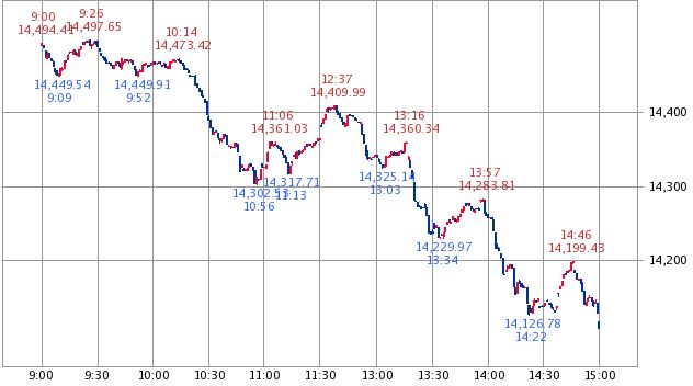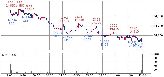 日経平均は10:14の14,473.42円から10:56の14,302.53円、12:37の14,409.99円から13:03の14,325.14円、13:16の14,360.34円から13:34の14,229.97円、13:57の14,283.81円から14:22の14,126.78円、14:46の14,199.43円から15:00の14,109.34円と何度か下落を繰り返して朝の寄り付きの大幅な上昇が一転して、大引けでは大幅下落となりました。