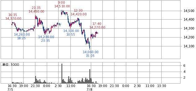 また、アジア株式市場の相場下落の影響からかシカゴグローベックスのダウ平均先物価格も同様に下落し、も東証の朝の寄り付きの頃の15,110ドルから大引けの時間である15:00には15,065ドルと下落していたことも世界的な株安傾向を想起させたかもしれません。