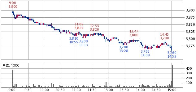 ・ホンダは初値が3,900円で終値が3,760円と140円(前日比-80円)の下落