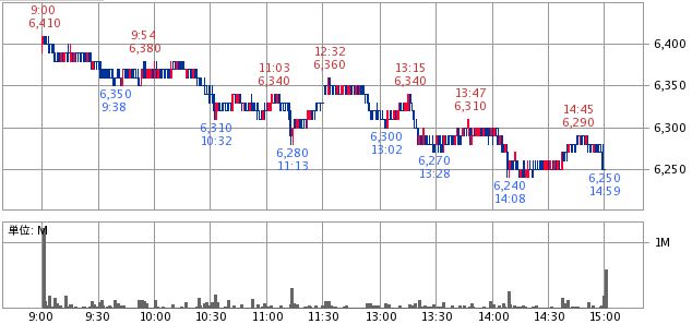 ・トヨタは初値が6,410円で終値が6,250円と160円(前日比-60円)の下落