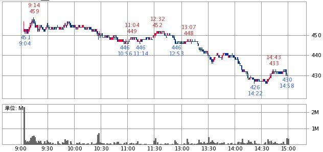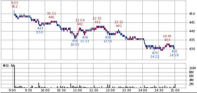 ・シャープは初値が451円で終値が430円と21円(前日比-8円)の下落