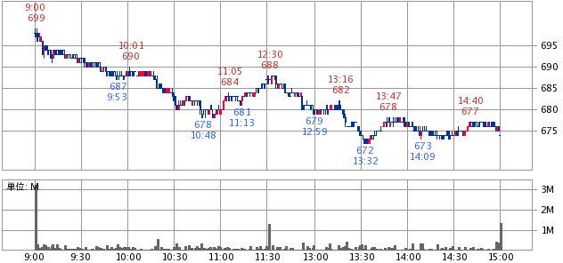 ・日立は初値が699円で終値が674円と25円(前日比-14円)の下落