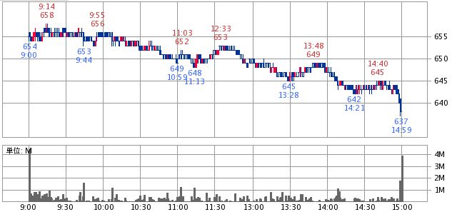 三菱UFJは14:50頃の644円から終値が638円と僅か10分で約1%と特に大きな下落となっているのが特徴的です。