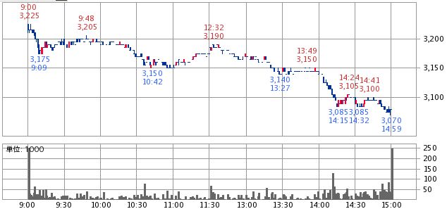 ・三井不動産は初値が3,225円で終値が3,080円と145円(前日比-120円)の下落