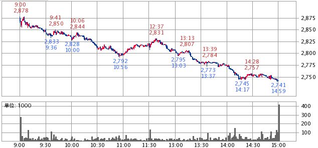 ・三菱地所は初値が2,878円で終値が2,742円と146円(前日比-131円)の下落