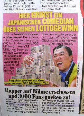 ドイツ最大の部数を誇る大衆紙ビルトは11日付の紙面で「日本のコメディアンが大当たり」との見出しの記事を掲載、お笑いタレントのスギちゃんがくじに当選し、5億円を獲得したと誤って報じたそうです。