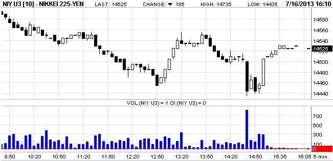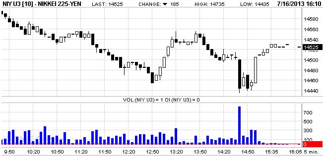 昨晩のシカゴ日経平均先物はNYダウが下落したため、シカゴ時間16:10(NY時間17:10、日本時間6:10)で14,525円(前日:14,695円、東証終値14,599.12円、東証終値比-74円)とNYダウより大きく下落しています。