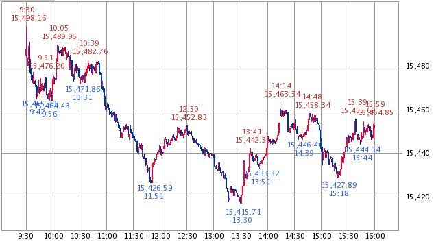 なお、NYダウより大きく下落した理由は、その頃のドル円が99.1円(前日:98.8円)くらいでしたから為替は前日の東証終値14,599.12円の頃のドル円が99.8円より僅かに0.7円の円安ドル高となった影響のようです。