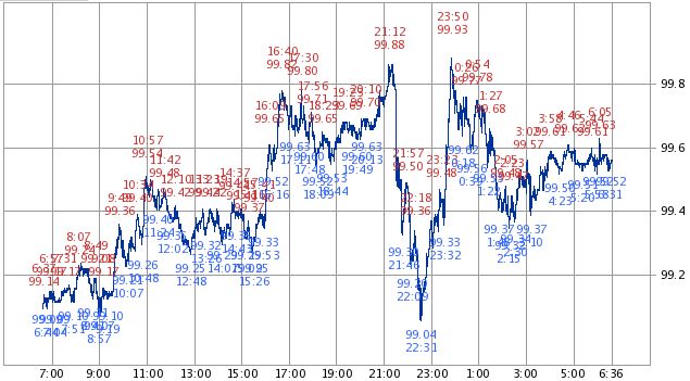 その頃のドル円が99.5円(前日:99.1円)くらいでしたから為替は前日の東証終値14,615.04円の頃のドル円が99.3円より僅かに0.2円の円安ドル高となった影響のようです。