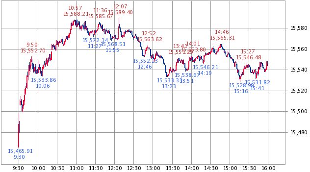 その結果、NYダウはNY時間16:00(シカゴ時間15:00、日本時間5:00)の終値で15,548.54ドル(前日:15,470.52ドル、前日比+78.02ドル)と終値で過去最高値を更新しています。