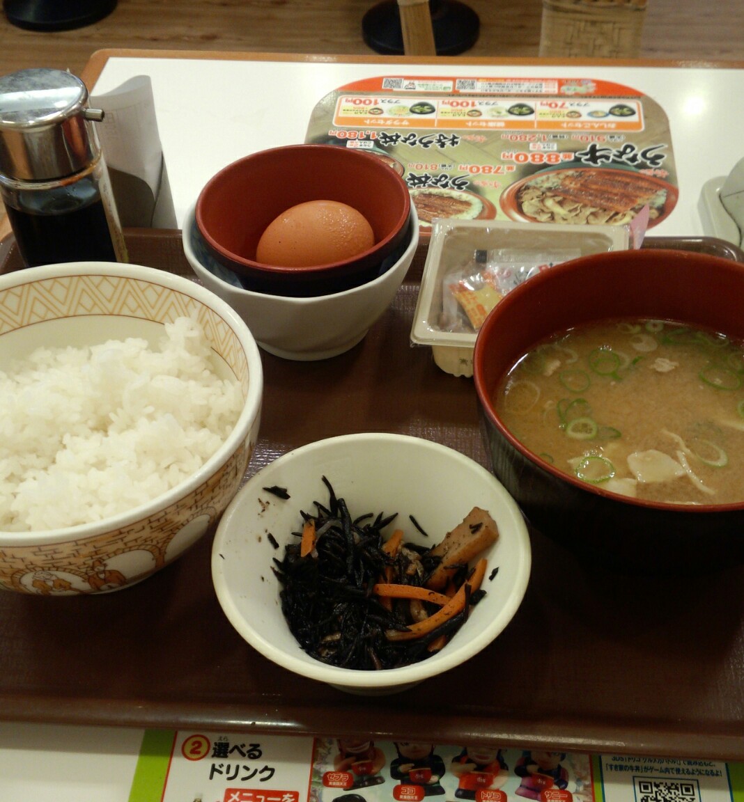 たまには食べたくなるもので、すき家の朝定なんぞをいただきました(^o^)