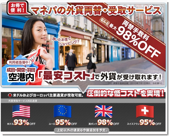 ドルやユーロなどに両替する場合、空港で換金するとだいたい3円~4円の手数料を取られます。今だったらドル円100円なのに、103円~104円での換金になるということですね。そこで今日ご紹介したいのが「マネーパートナーズ」の両替サービス!