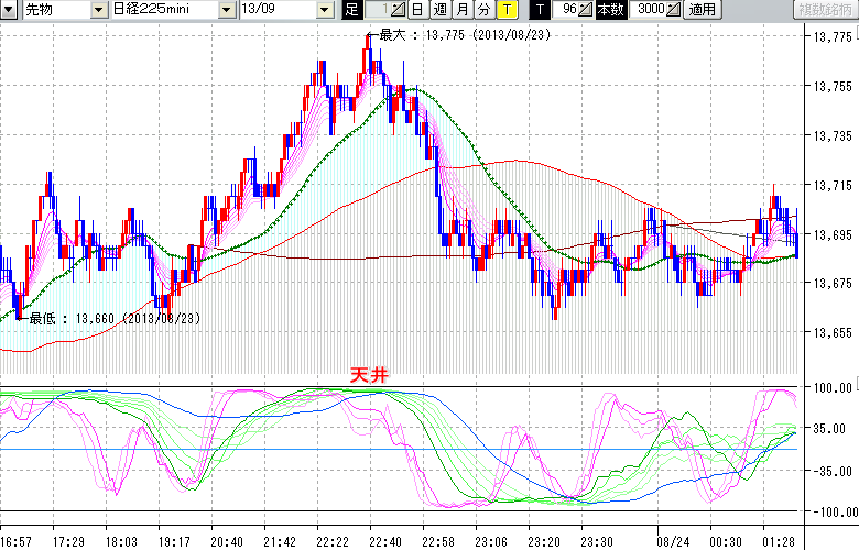 指標ラインの密集点が天底・転換点を示します。指標の見方