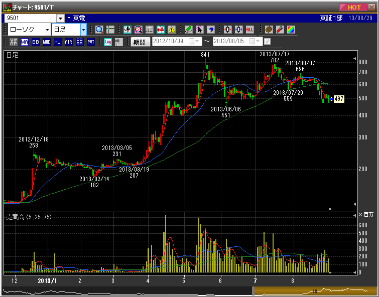 今日の焦臭いチャートはこちら。東京電力〈9501〉。