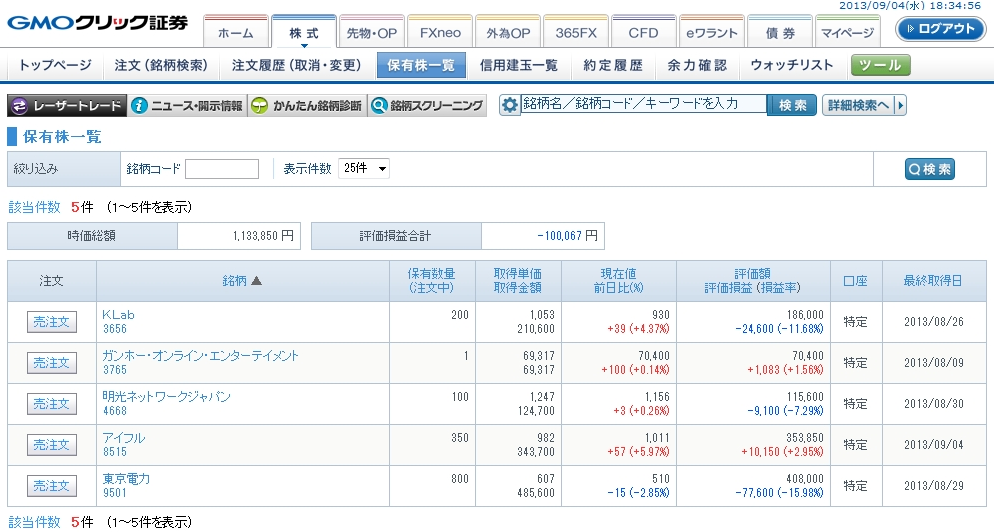 ゆきママの株口座もようやく復活傾向。ガンホー、アイフルがプラ転しています。・゚・(ノД`)・゚・。ホントウニヨカッタ… 一時期20万円近くあった含み損が半額ぐらいまで減りました。これまでの確定益が+9万円ぐらいあるので、もうちょっとでトータルでの収支がトントンラインまできそうですね。
