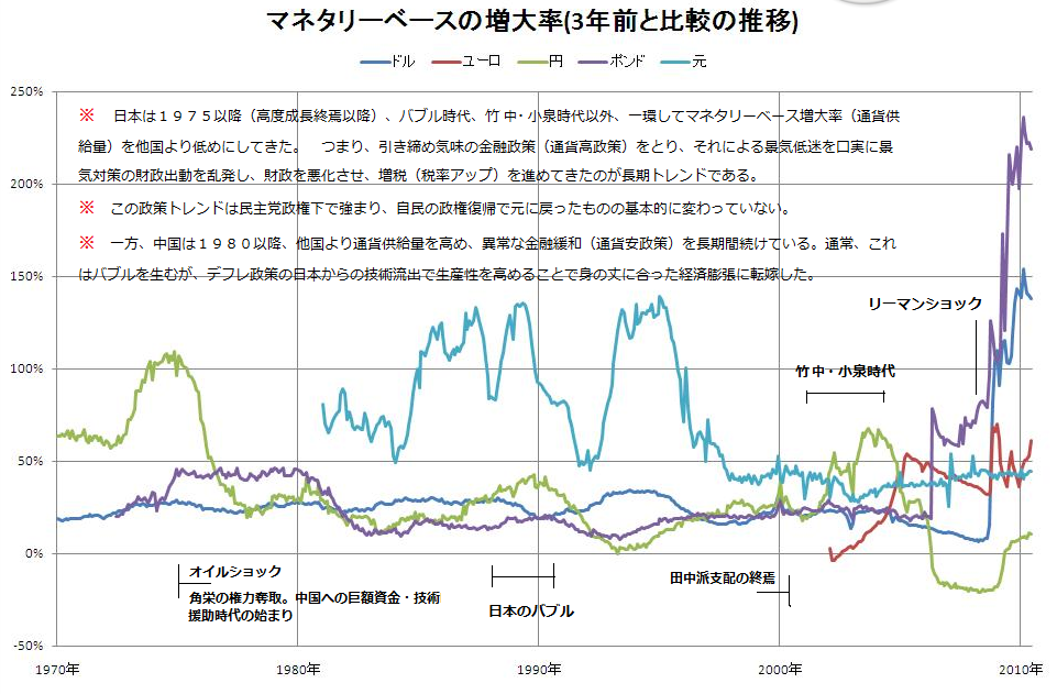 添付図はそれぞれ「各国と比較した日本の成長率の凋落状況」、「日本の経済規模、名目GDPが拡大しないのに日本の政府支出が激増している状況(財政出動ガンガン路線)」、「オイルショック以降、ほぼ一貫して日本の金融が各国に対し引締め的な状況にあること(マネタリーベース増大率、通貨供給量が低目、つまりは引締め的金融政策であり通貨高、円高、デフレ路線)」を示す。