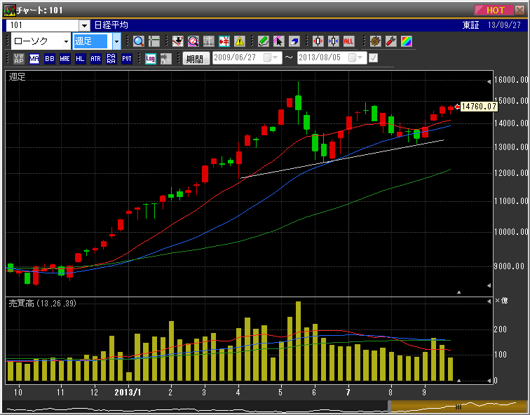 週足はまた陽線となったが、先週と今週の高値が1円しか変わらない点に手詰まり感があるのも確か。
