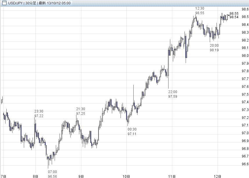 10月7日~10月11日の週のドル円相場は1ドル=96.56~98.55円