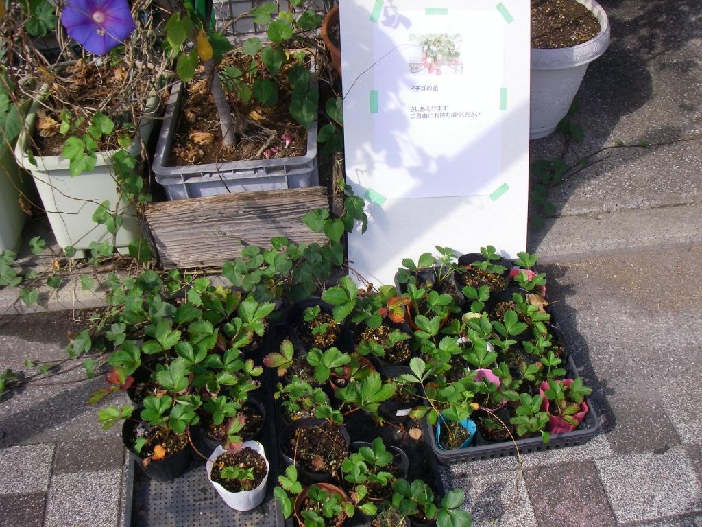 お昼に、余ったイチゴの苗を屋上から降ろしてうちの前の道路に店開き