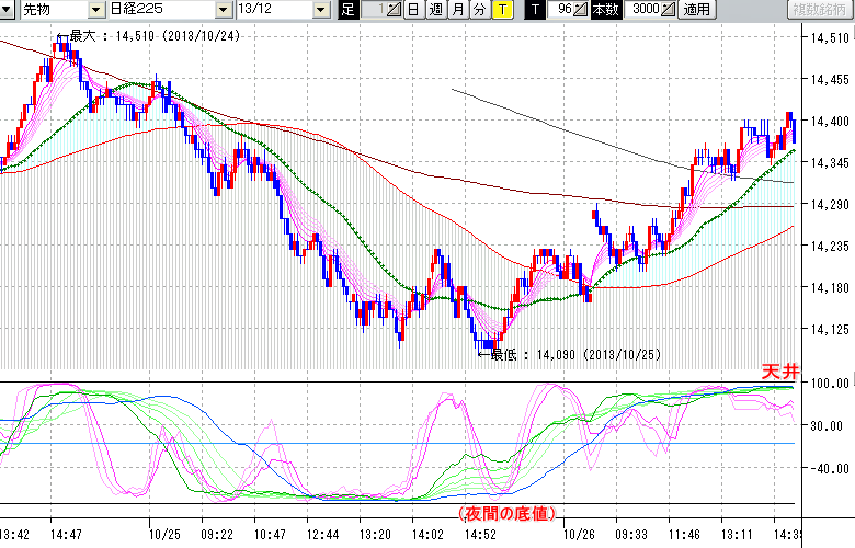 指標ラインの密集点が天底・転換点を示します。指標の見方