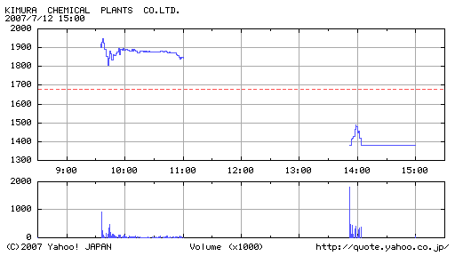 朝は買い気配で始まり、前日比+240円高の1,919で寄り付きます。その2分後+271円の1,950まで上昇、これが今日の高値となりました。そこから多少上下に振れる事はありましたが、概ね1,870~80辺りで推移。前場終了15分前位から崩れはじめ、前場の引け値は1,845円でした。この時点で高値からは100円以上の下落です。