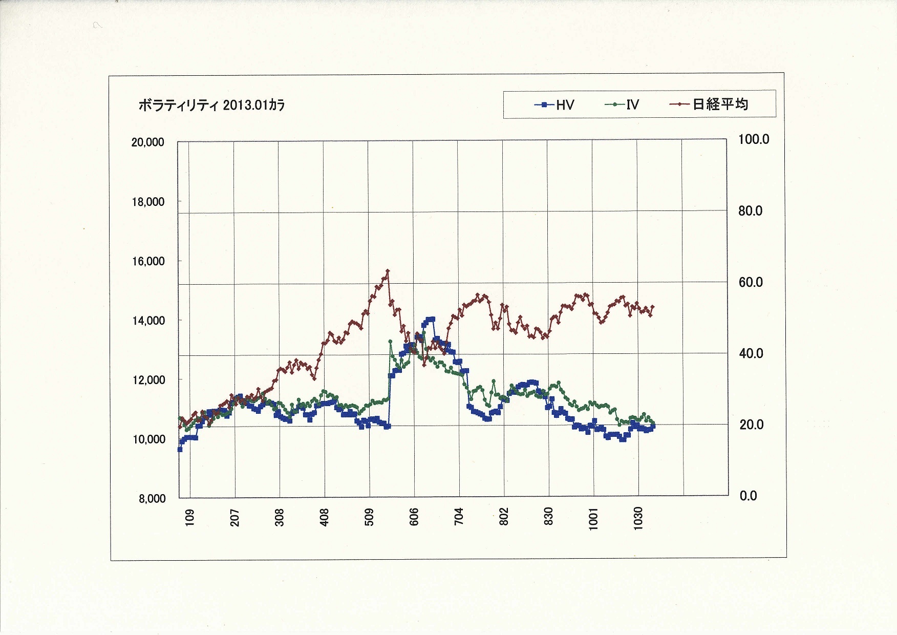 添付したグラフは今年1月から11/11までの日経平均とボラティリティ(HVとIV)の動きを表したものである。ヒストリカルボラティリティ(HV)は期間20日の計算値、IVは日経が毎日発表しているデータである。これを見るとそれなりに面白いことが見えてくる。