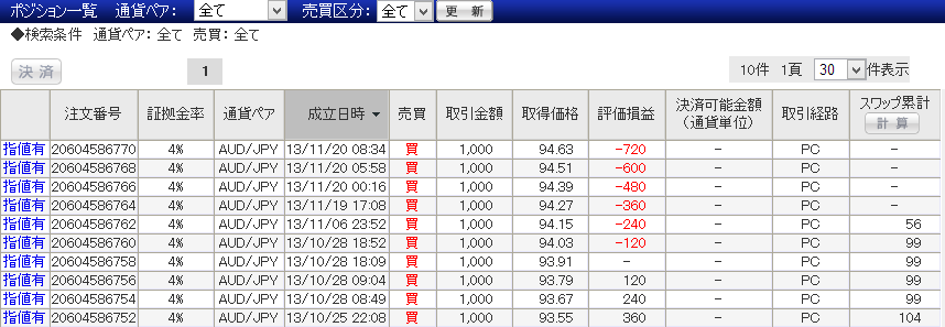 最初のポジション:10/25 93.55買い から12銭ごとに0.1万豪ドルをキレイに買い増していますね。