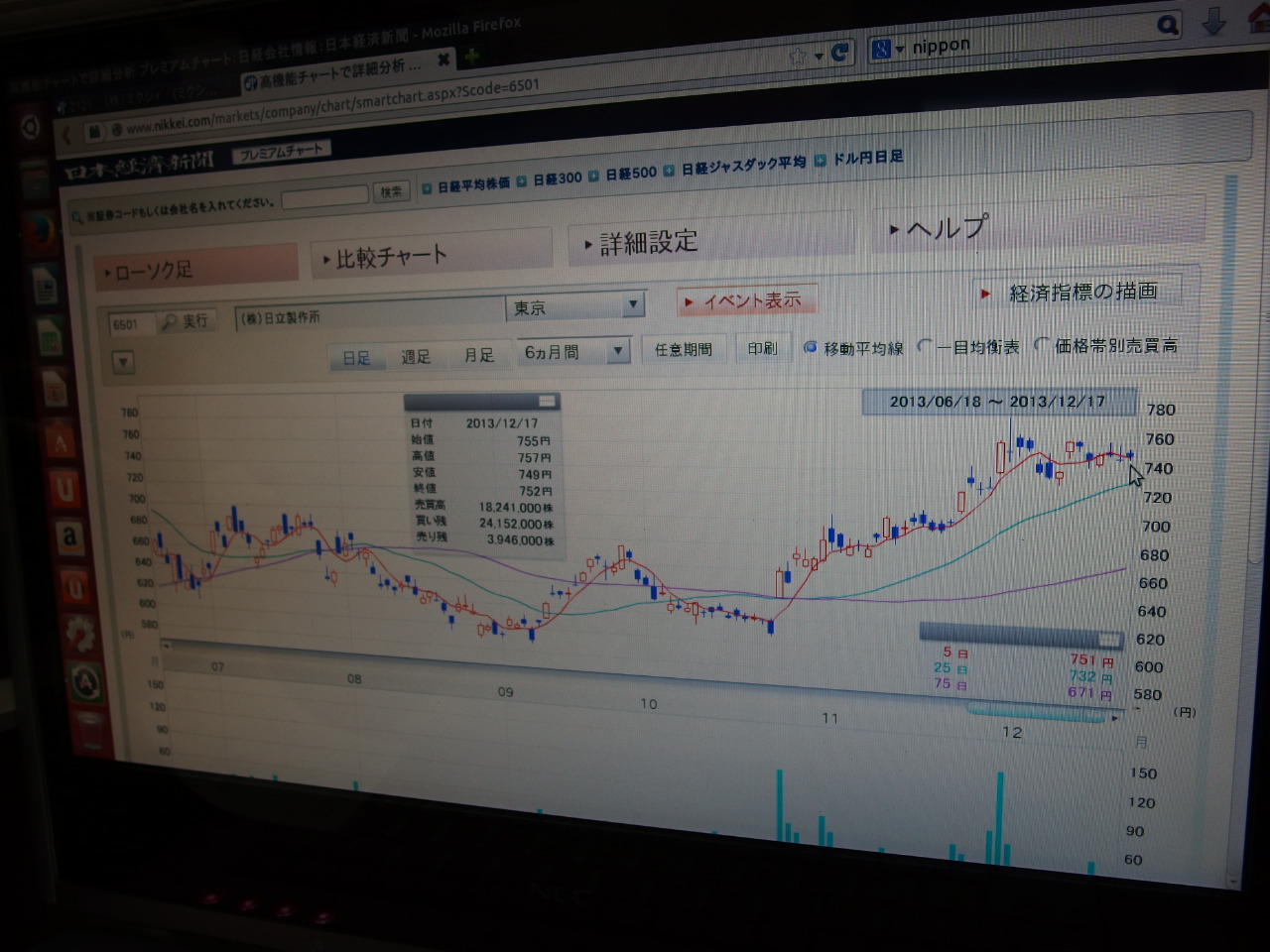 写真は ubuntu で日経新聞のサイトのチャート(銘柄は日立)を表示してるところです