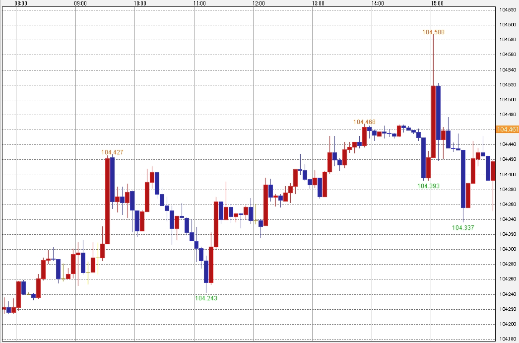 そしてここからは昨日今日のドル・円相場についてまとめていきます。昨日の海外市場は、1ドル=103.80~104.30円台で全体的に堅調な推移となりました。序盤は材料不足から下値圏でのモミ合いが続いていましたが、その後は株価の堅調さを背景にジリジリと上昇を続けました。