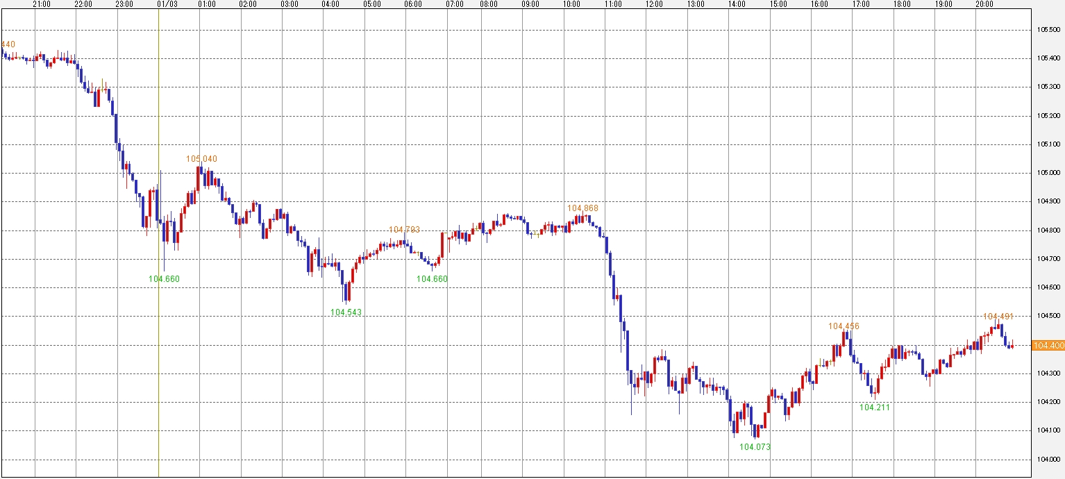NY市場では序盤こそジリジリと上値を伸ばして昨年の高値を更新したものの、株価が下落すると一転してリスクオフムードに傾き、注目された(米)12月ISM製造業景況指数を前に短期筋からのまとまった売り注文を受けて、大きく下落しました。結局ISMがまずまずの結果となったことで、105円台に復帰する場面も見られましたが、一旦節目を割り込んだことで上値が重く、戻しきることなく取引を終えました。