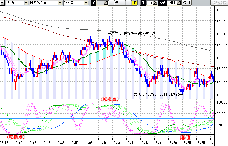 指標ラインの密集点が天底・転換点を示します。指標の見方