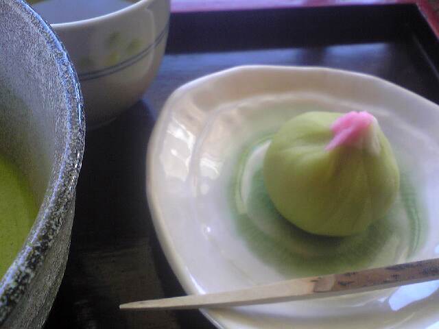 抹茶は美味しい。中身は赤餡で真昼間のようなボタンを表してる。
