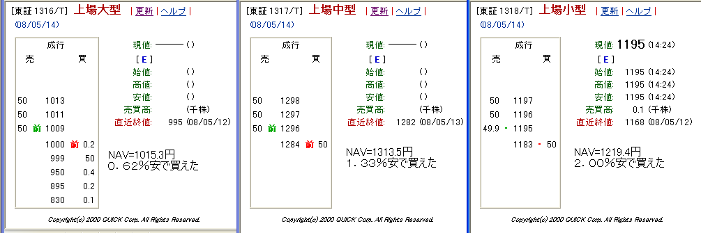 規模別ETF(大型・中型・小型)の大引けの板の状況はごらんのとおりですが、NAVに対する乖離と指数騰落率を見比べると、手入れが全然されていなかったように思えます。ひょっとして、午前9時からこんな感じの板だったのでしょうか?