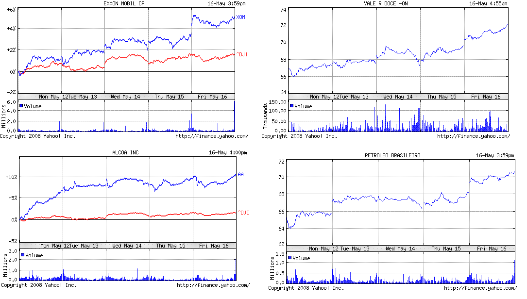 参考までに5daysのチャートを。上から、エクソン、アルコア、ヴァーレ、ペトロブラス。エクソン、アルコアはダウとの比較も。