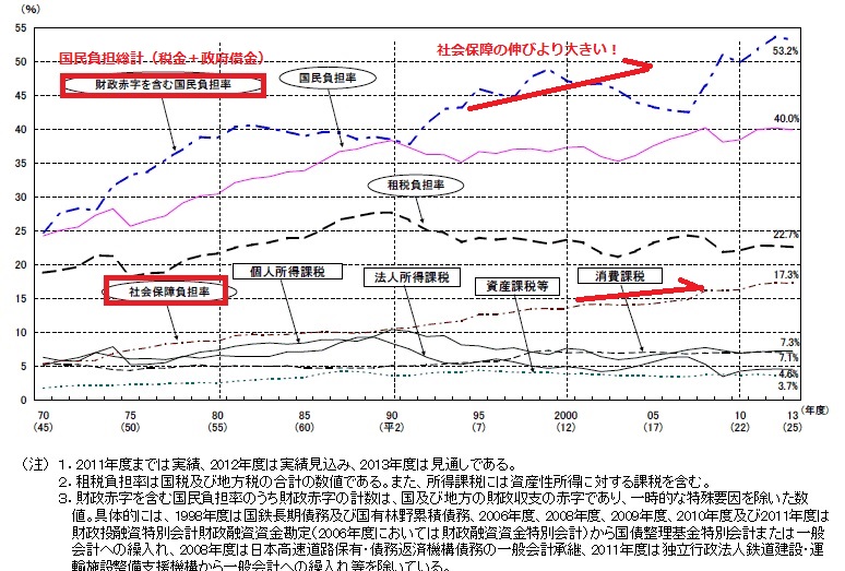 国民負担(税金+国債(国民借金))の増大では、社会保障関連の伸びよりも、全体の伸びのほうが大きいのです。 つまり、社会保障よりもそれ以外に使われるお金のほうが大きい。