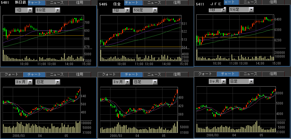 鉄鋼株は鋼材の値上げ幅次第なんでしょうね。鋼材の需給自体は悪く無い感じみたいです http://www.jisf.or.jp/data/jyukyu/index.html ので競争力の高いメーカーは大幅に値上げする事も可能なんじゃ無いでしょうか。後、中国で大きな地震があったので今後鋼材の需給がひっ迫するかもしれないんだそうで、この影響もいろいろと考えなければいけないので難しいですね。