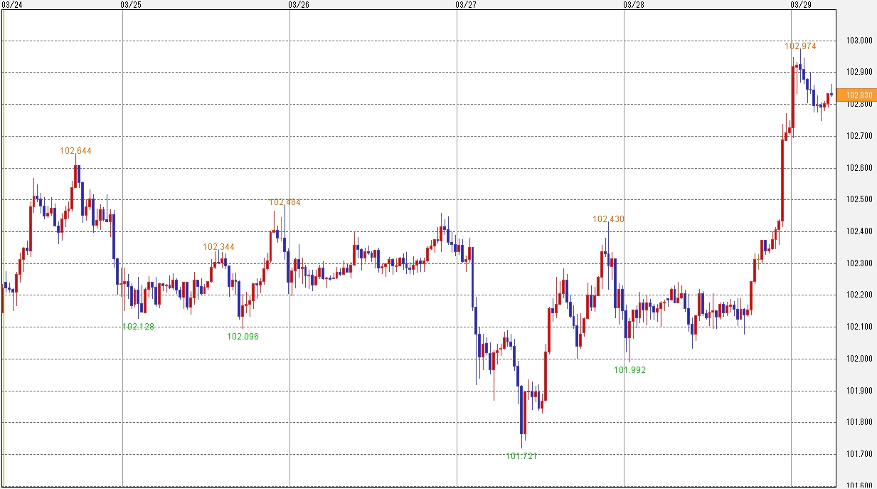 3月24日~3月28日の週。ドル円相場は1ドル=101.72~102.97円