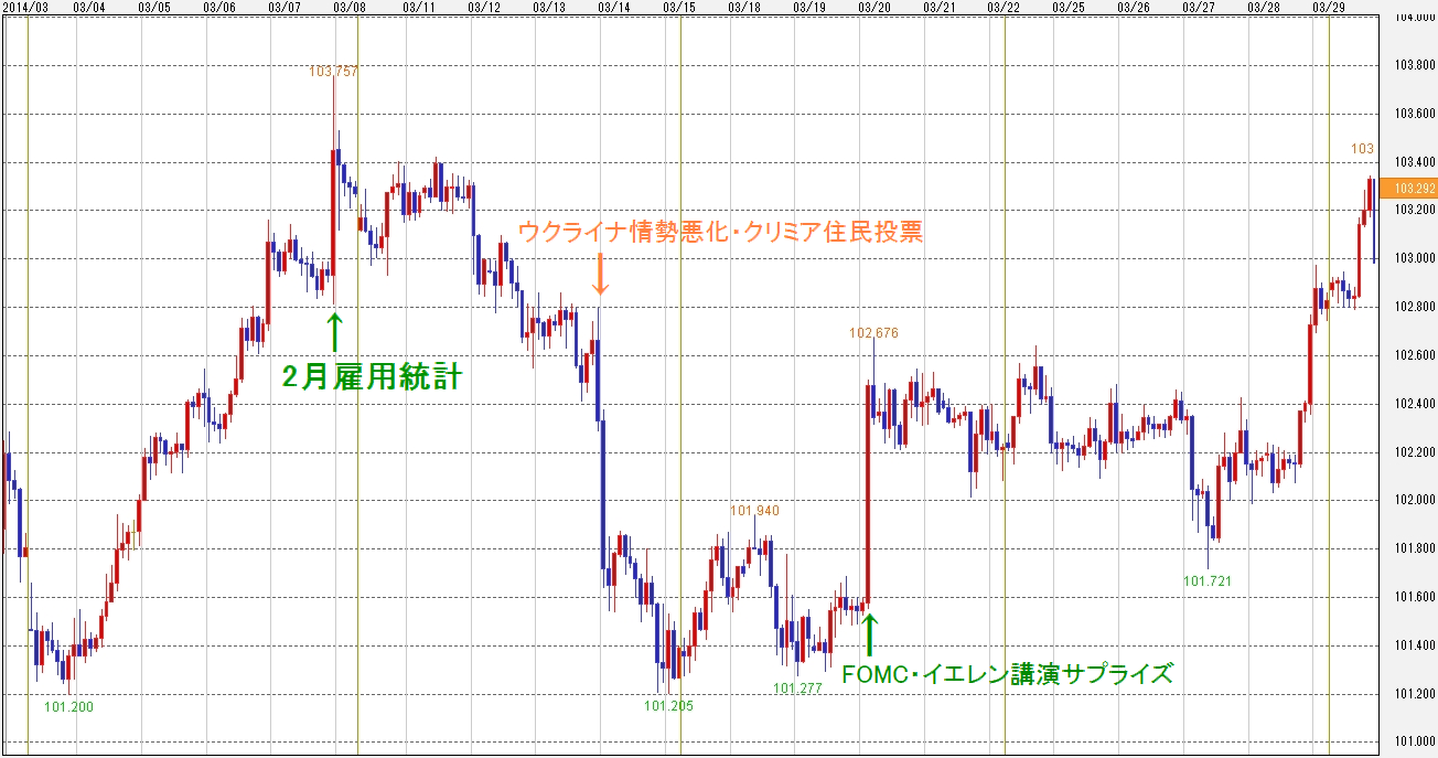 2月雇用統計の好結果によって上抜けが期待されたものの、その後はウクライナ情勢の緊迫化から押し戻されて膠着・・・といった流れでした。中盤にはイエレンFRB議長の記者会見でのサプライズから、大きく上昇する場面もみられましたが、その後はほとんど動きがない展開。