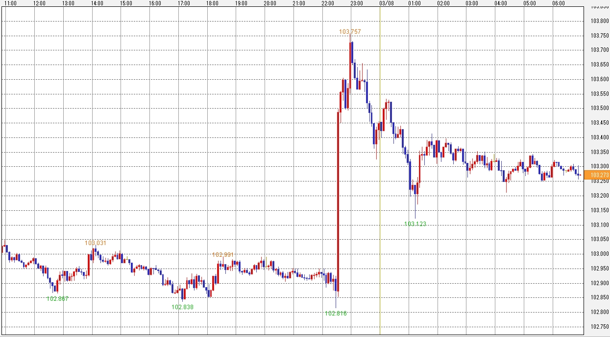 強気強気で一時は1ドル=104円台に突入したドル・円相場ですが、なんといってもいよいよ今日が天王山!21:30から(米)3月雇用統計(雇用者数・失業率)の発表が予定されています。