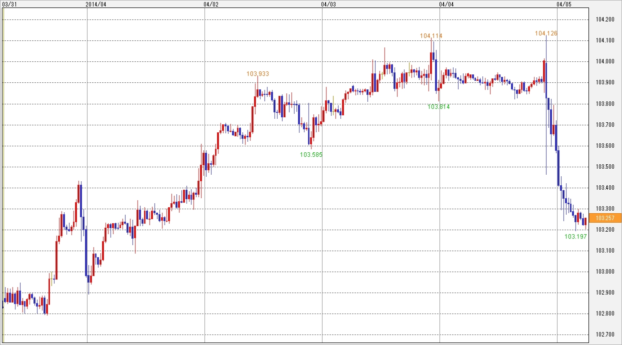 NY市場でも上値を試す動きは継続し、序盤にこの日の高値をつけた。しかしながら、イエレンFRB議長がハト派的な発言を繰り返したことにより、ドル・円は反落。これに関しては、前回のFOMCでタカ派と市場に受け取られたことに対する反動といったところ。ただその後、株価にとってはイエレンのハト派姿勢が好材料なり、NYダウが上昇し、その動きにドル・円もサポートされて103円台に復帰し、103円台でのモミ合いを続けたまま取引を終えた。