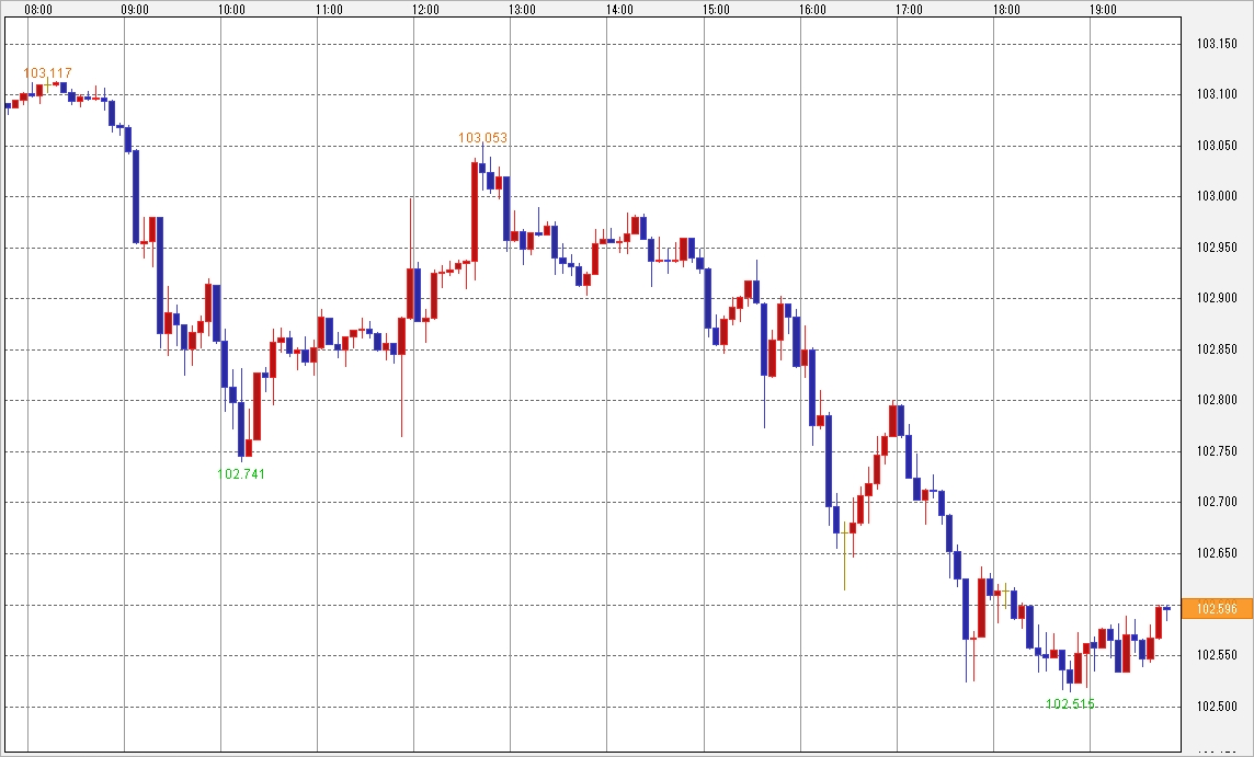 この会見を受けて、ドル・円は大きく値を下げてしまいました。前日までは鉄板と思われた103.00円ラインを再び大きく割り込むと、軟調な推移が一段と加速しました。