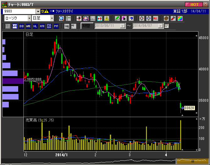 大引けにかけて買い戻しが入ったようでファーストリテイリングには大きな下髭が示現。