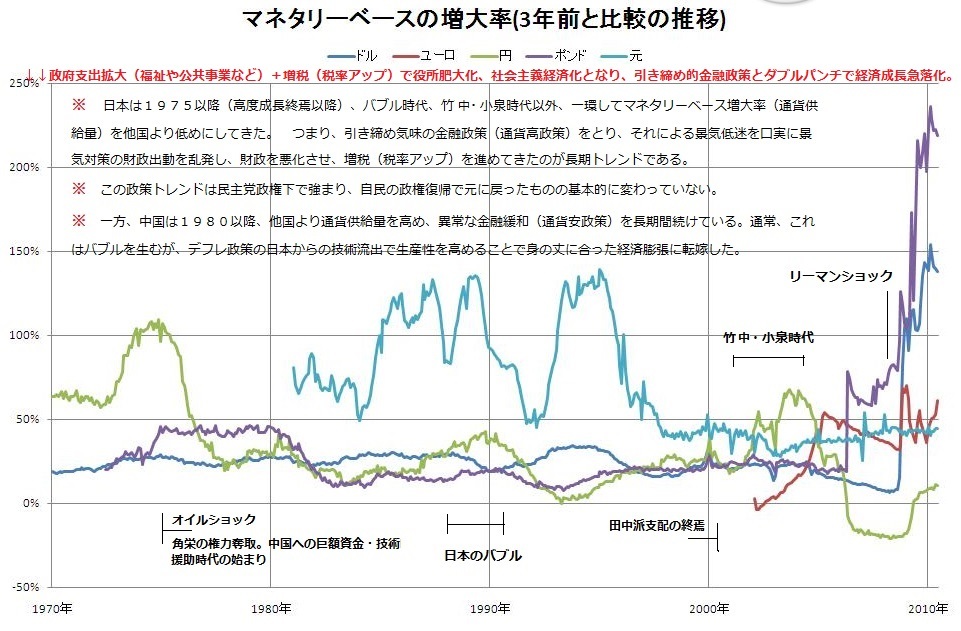 で、一部(多数?)のマスコミ、エコノミスト(日本のマスコミ、エコノミストは福祉拡大路線の左翼系(民主党系)や役所のポチがほとんど)を通じて喧伝されてる日本低成長論が、財務官僚たちが狙う金融緩和抑制=景気抑制政策を目くらましする援護射撃になってる。 マスコミ論説自体が財務官僚たちの宣伝(国民洗脳手段)になってる側面が大きい。