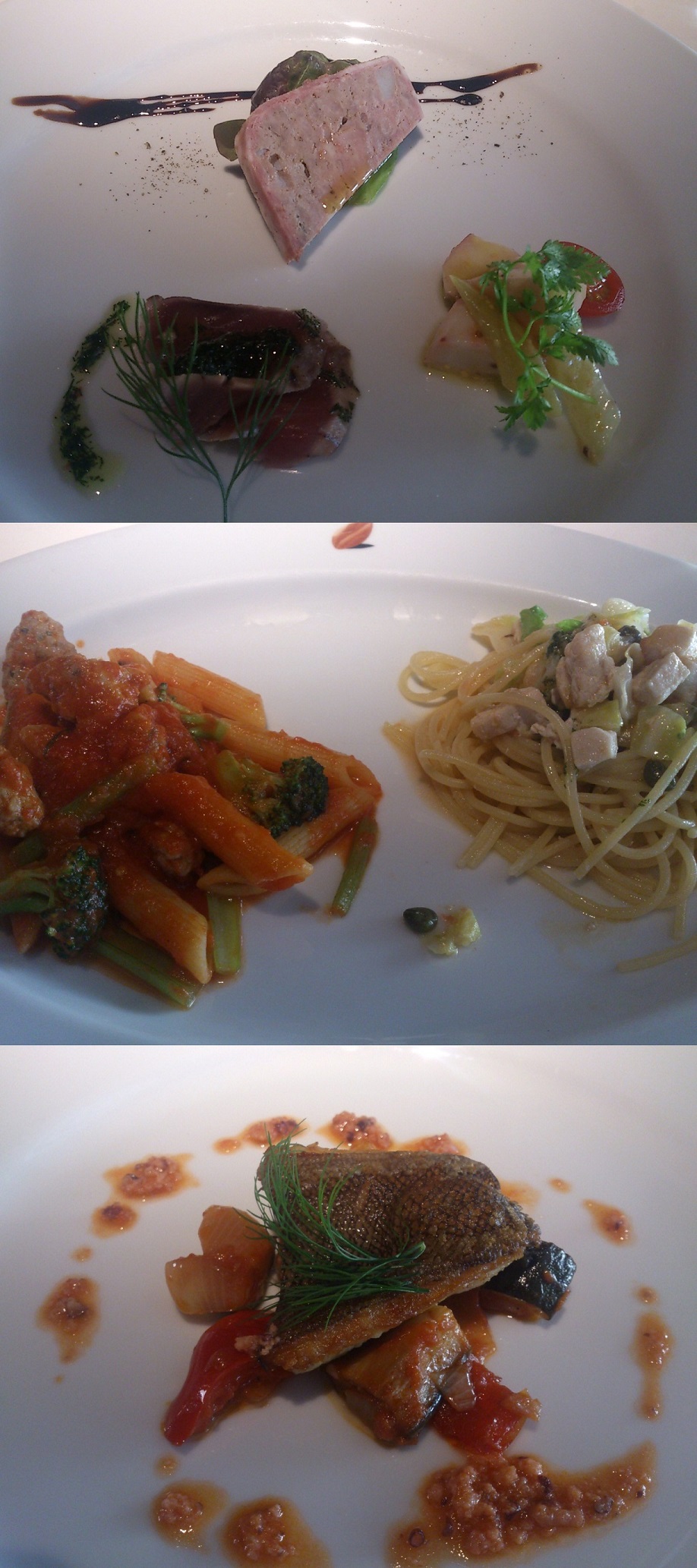前菜、パスタ、魚、肉、デザートのコース料理