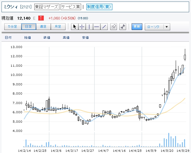 ミクシィ(2121)がついにディー・エヌ・エー(2432)を時価総額で上回ったようです。ちなみに今のミクシィの株価は12,140円・・・半年前にその半額で手放したゆきママとは一体なんだったのか・・・(-_-)シノウ…